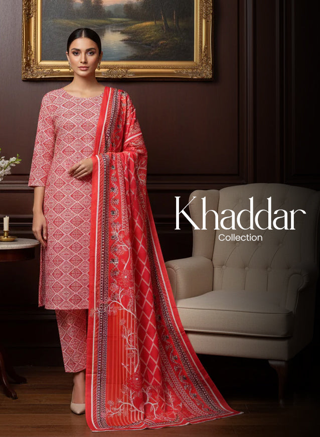 STRAWBERRY RED Khaddar Printed Suit with Khaddar Printed Dupatta 3pc Unstitched