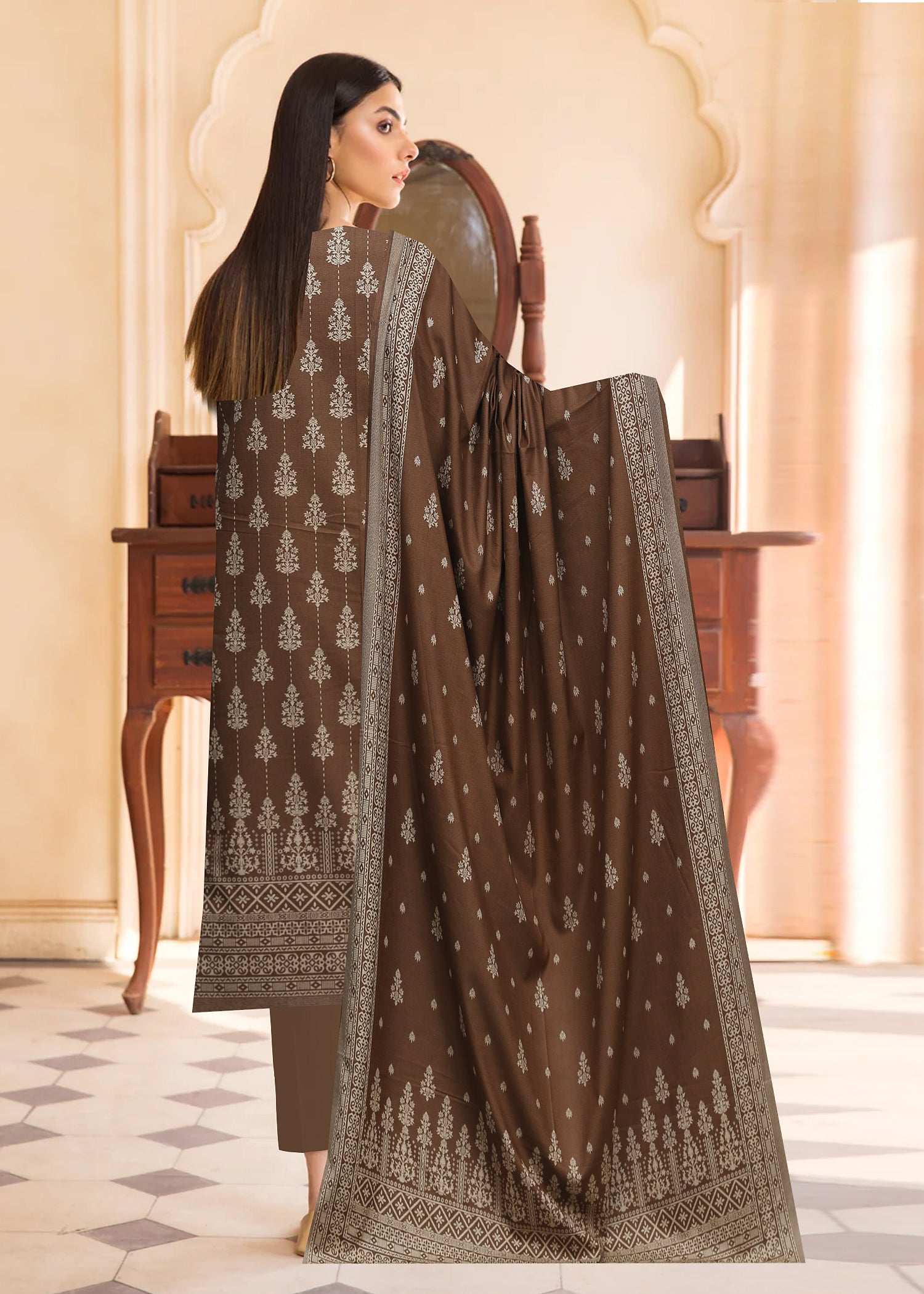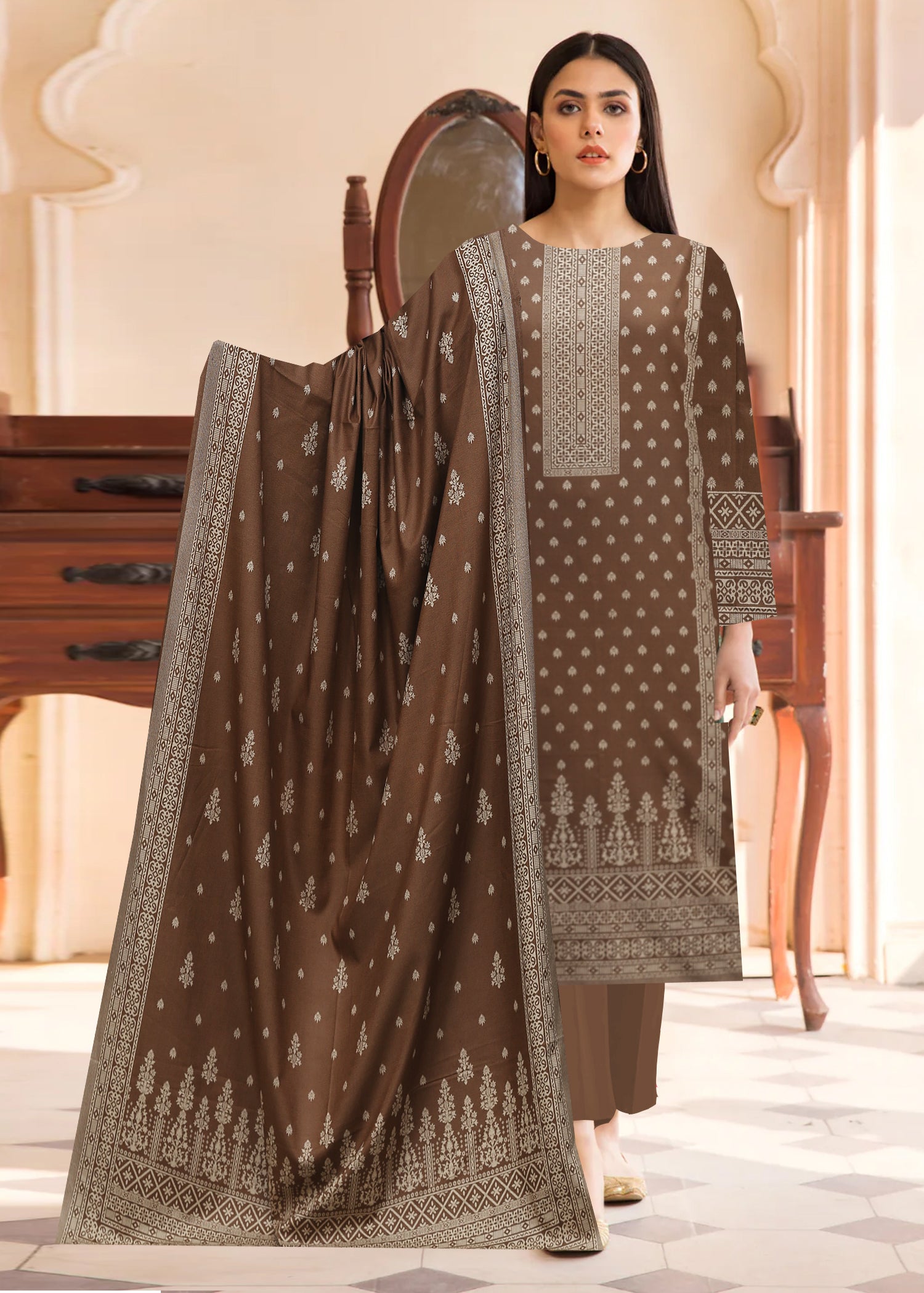 ASH BROWN 3Pc Premium Dhanak Printed Suits (Unstitched)