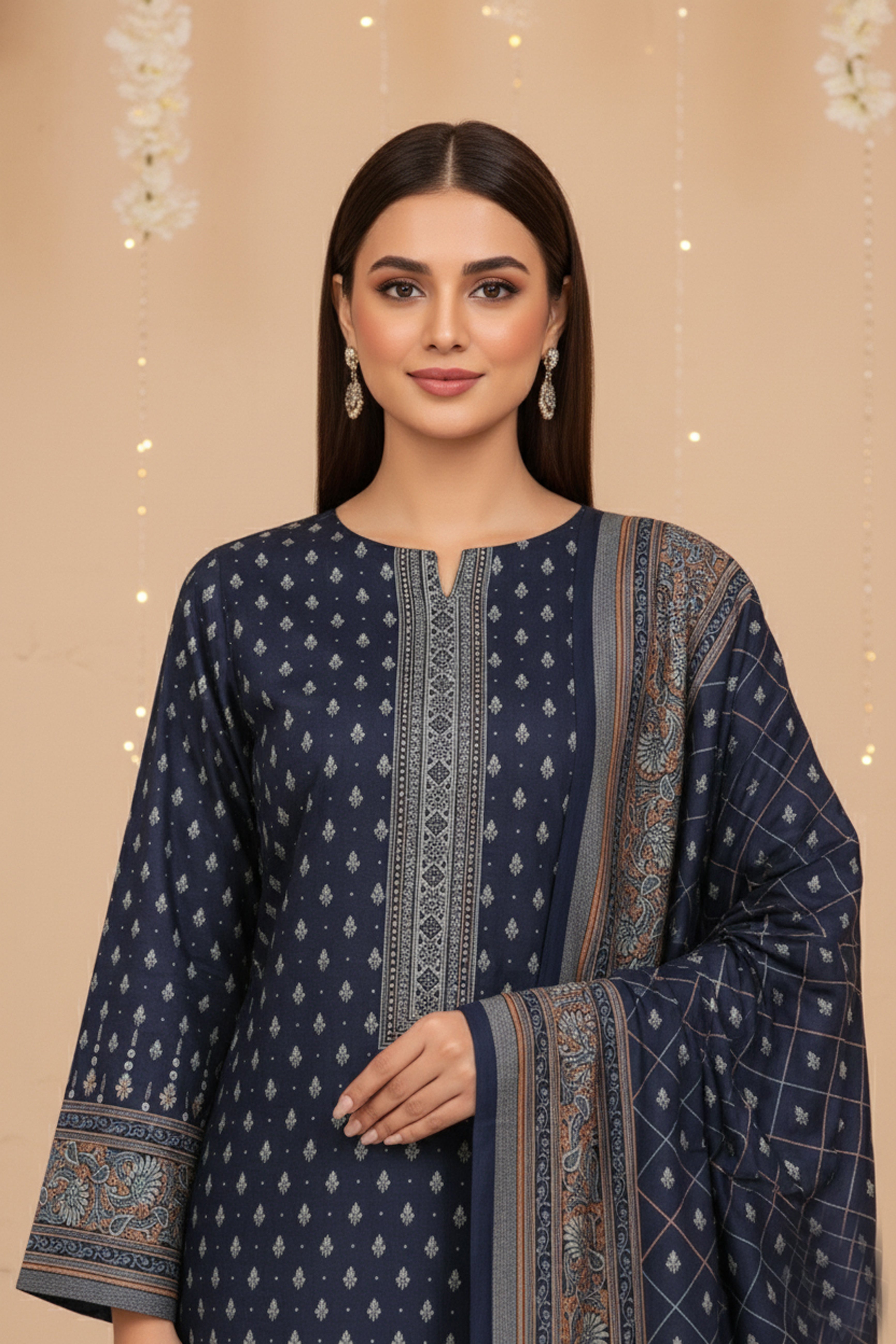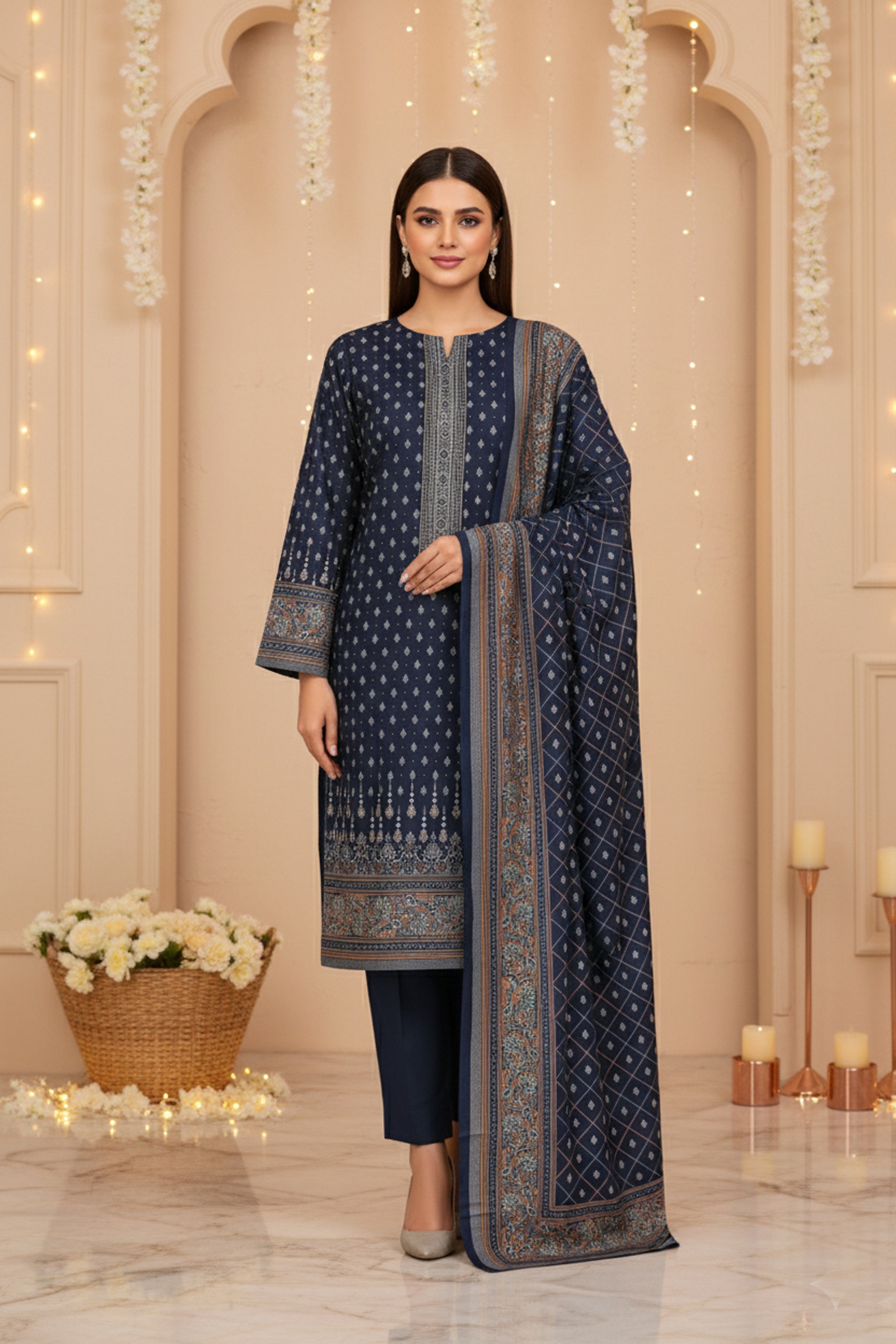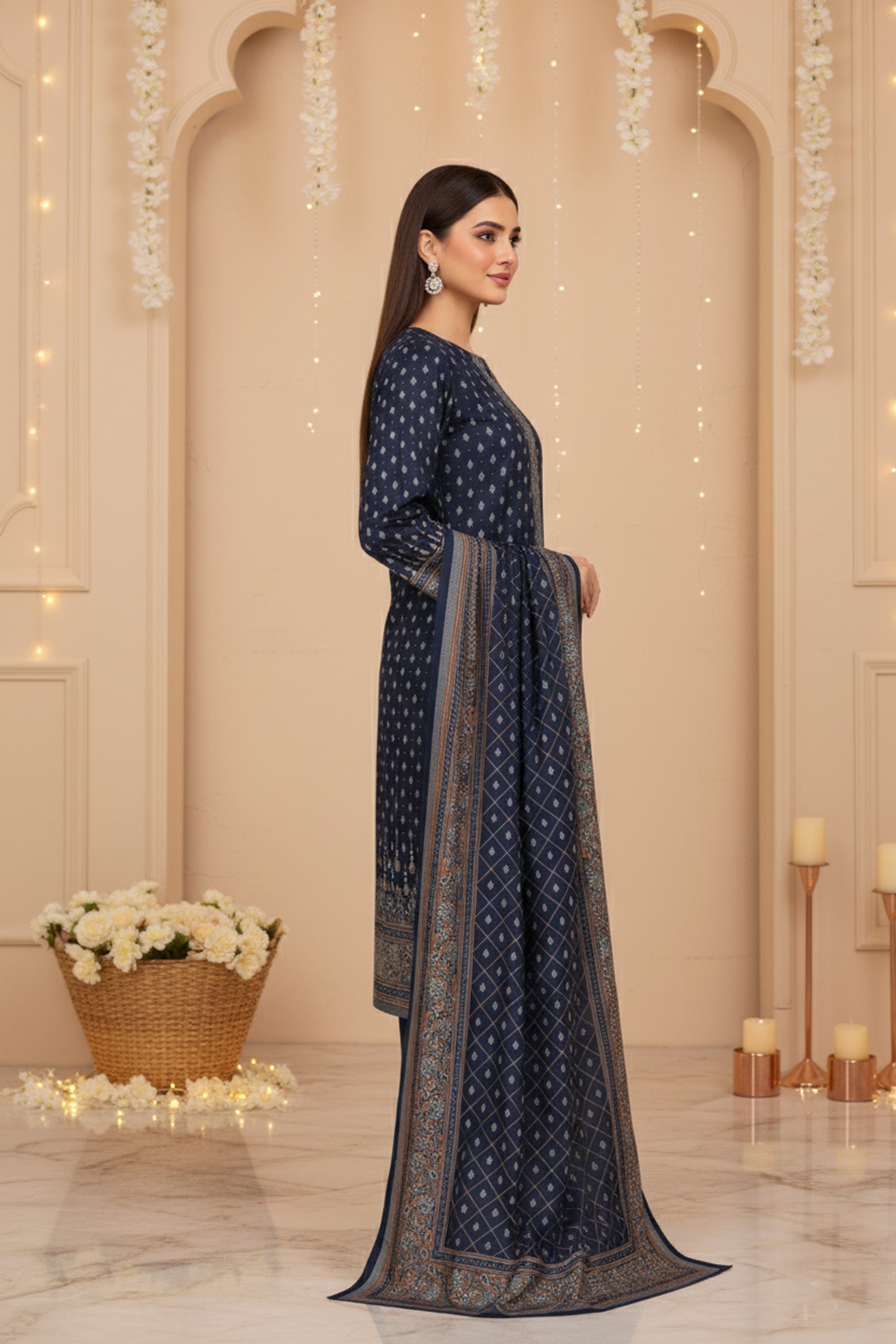 FRENCH NAVY BLUE 3Pc Premium Dhanak Printed Suits (Unstitched)