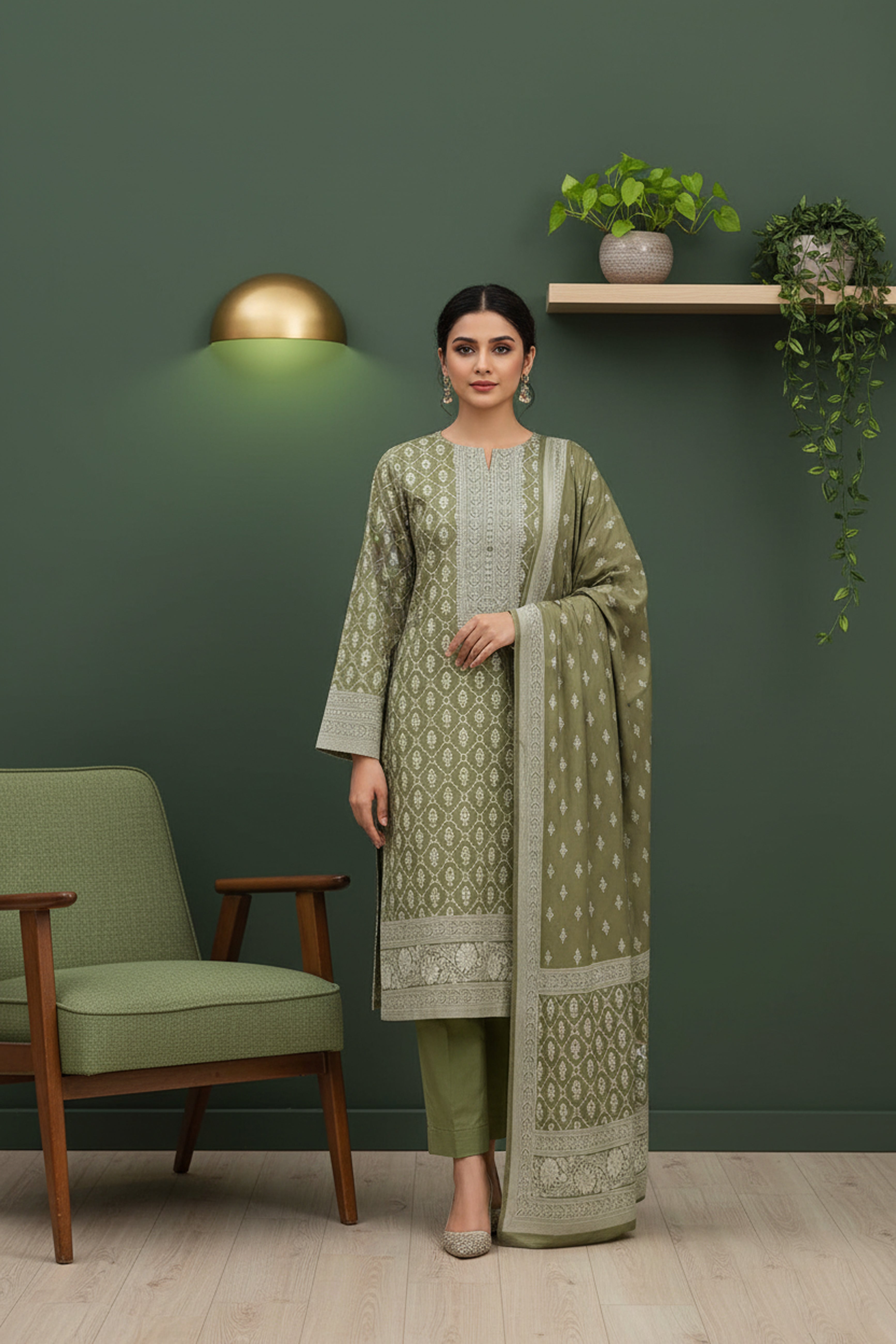 BASIL GREEN 3Pc Premium Dhanak Printed Suits (Unstitched)