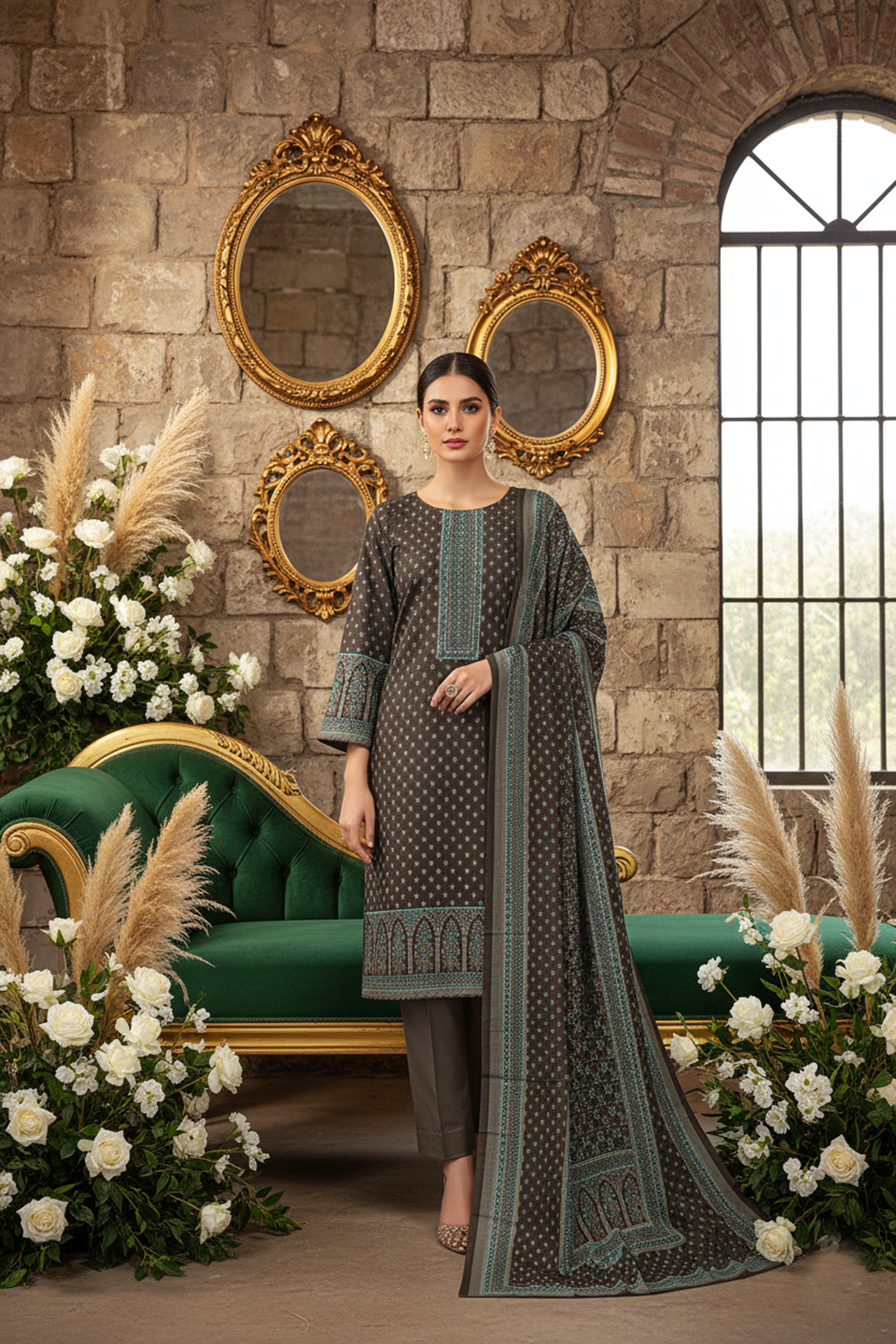 KHAKI BROWN 3Pc Premium Dhanak Printed Suits (Unstitched)