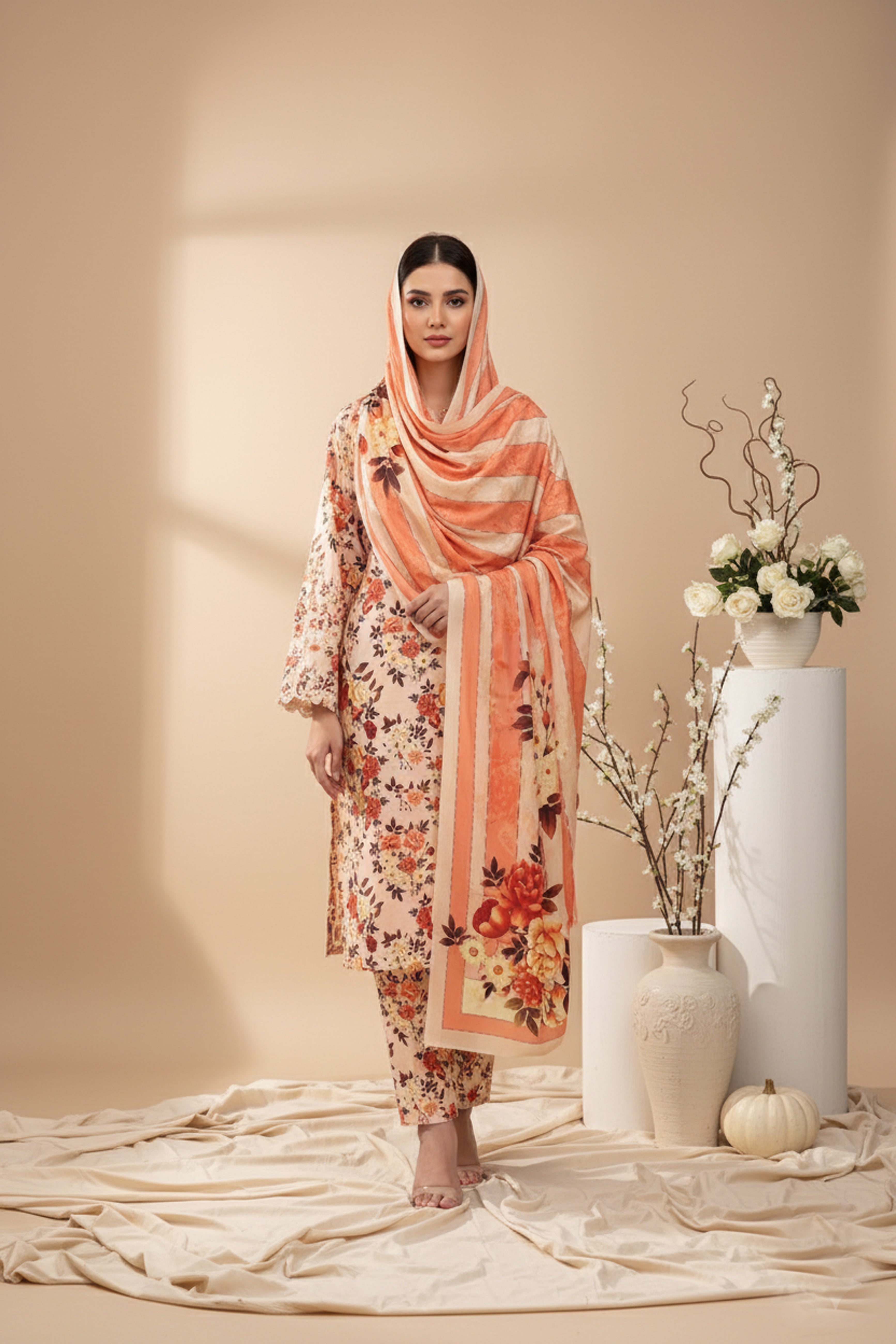 BASE PALE IVORY WITH MULTI PRINT 3pc Premium Doria linen suit with linen dupatta (Unstitched)