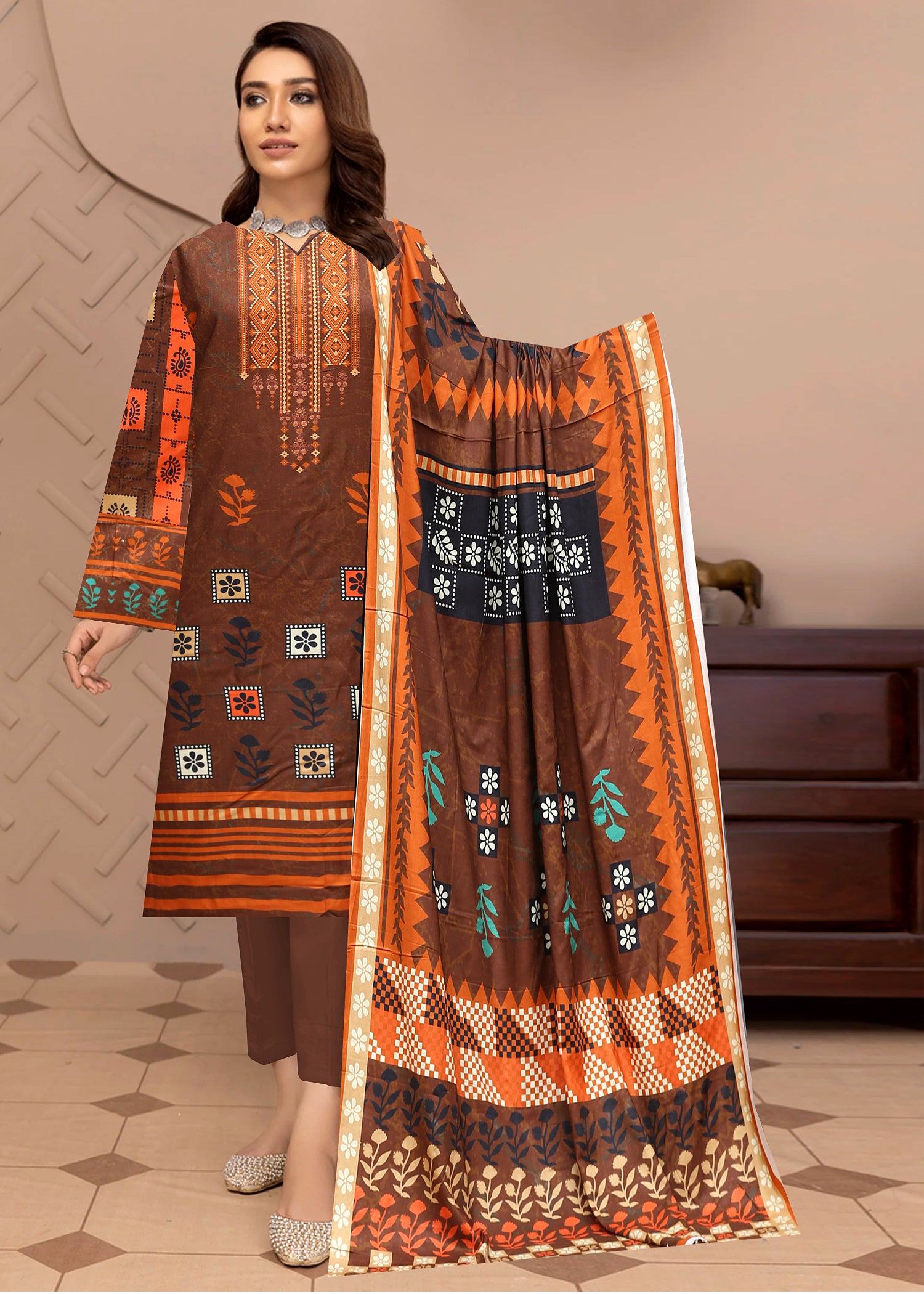 BASE BRUNTEE OR COFFEE BROWN WITH MULTI PRINT 3pc Premium linen printed suit with linen dupatta (Unstitched)