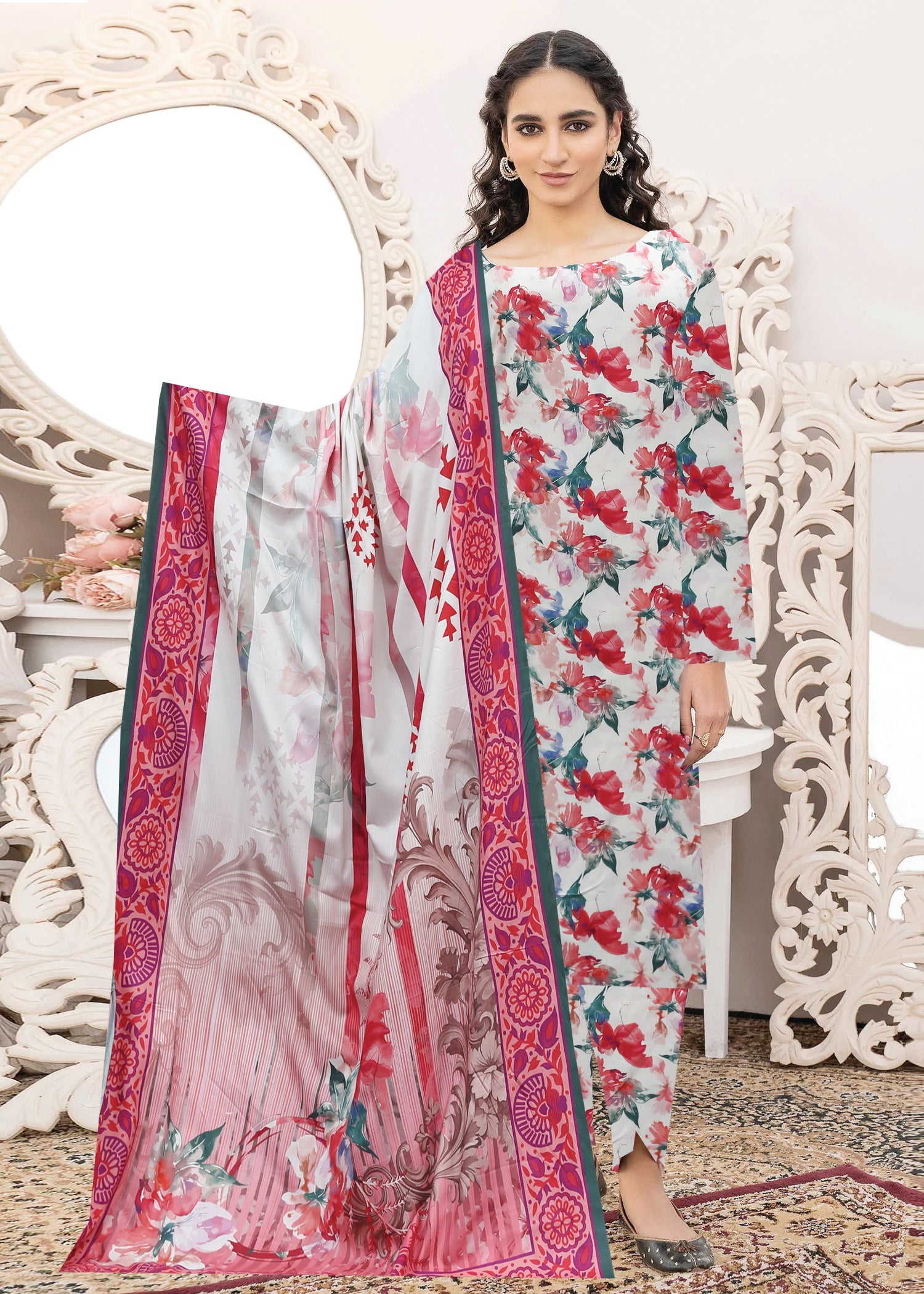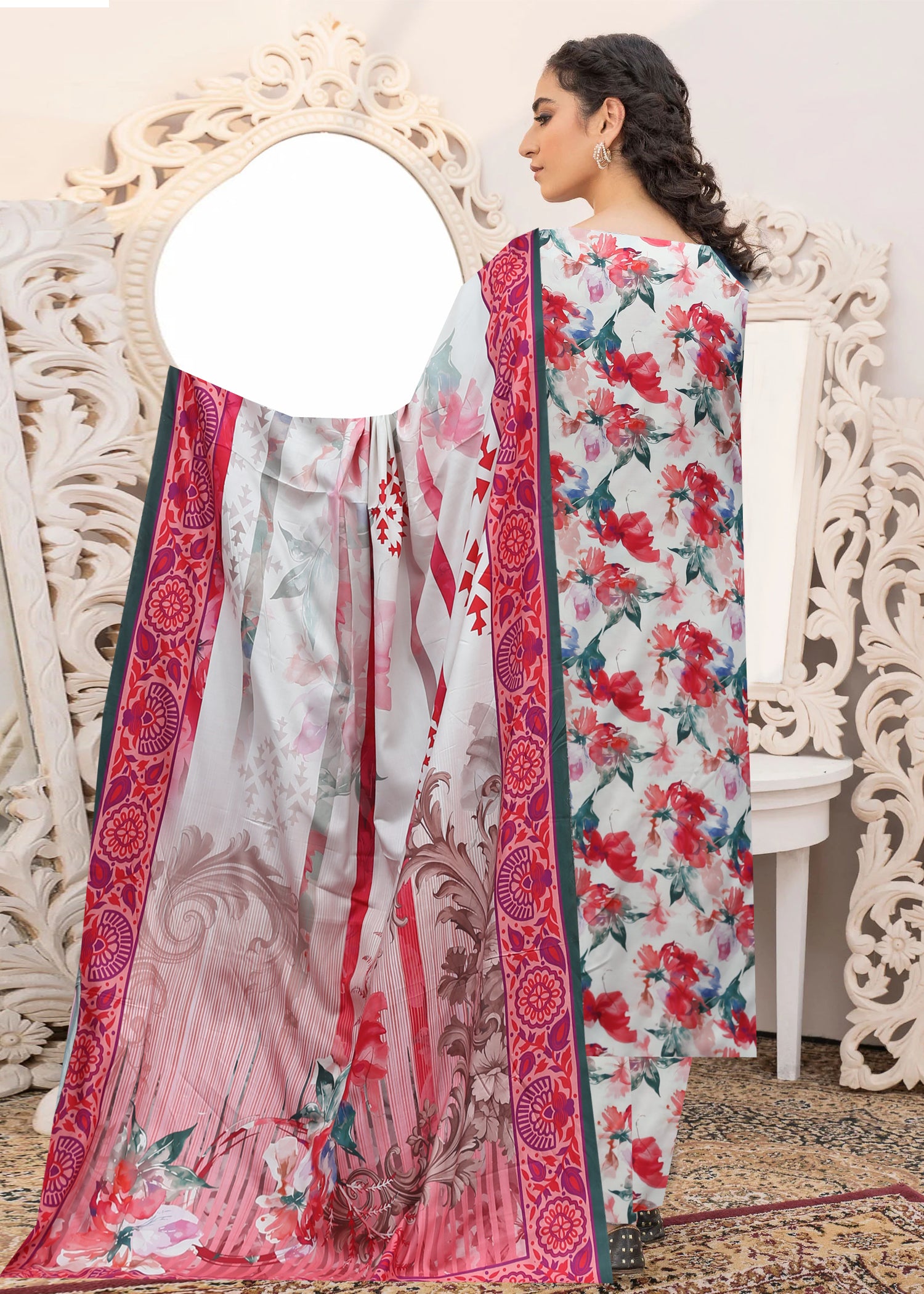 OFF WHITE CARROT RED AND PEACH 3pc Premium linen suit with linen dupatta (Unstitched)