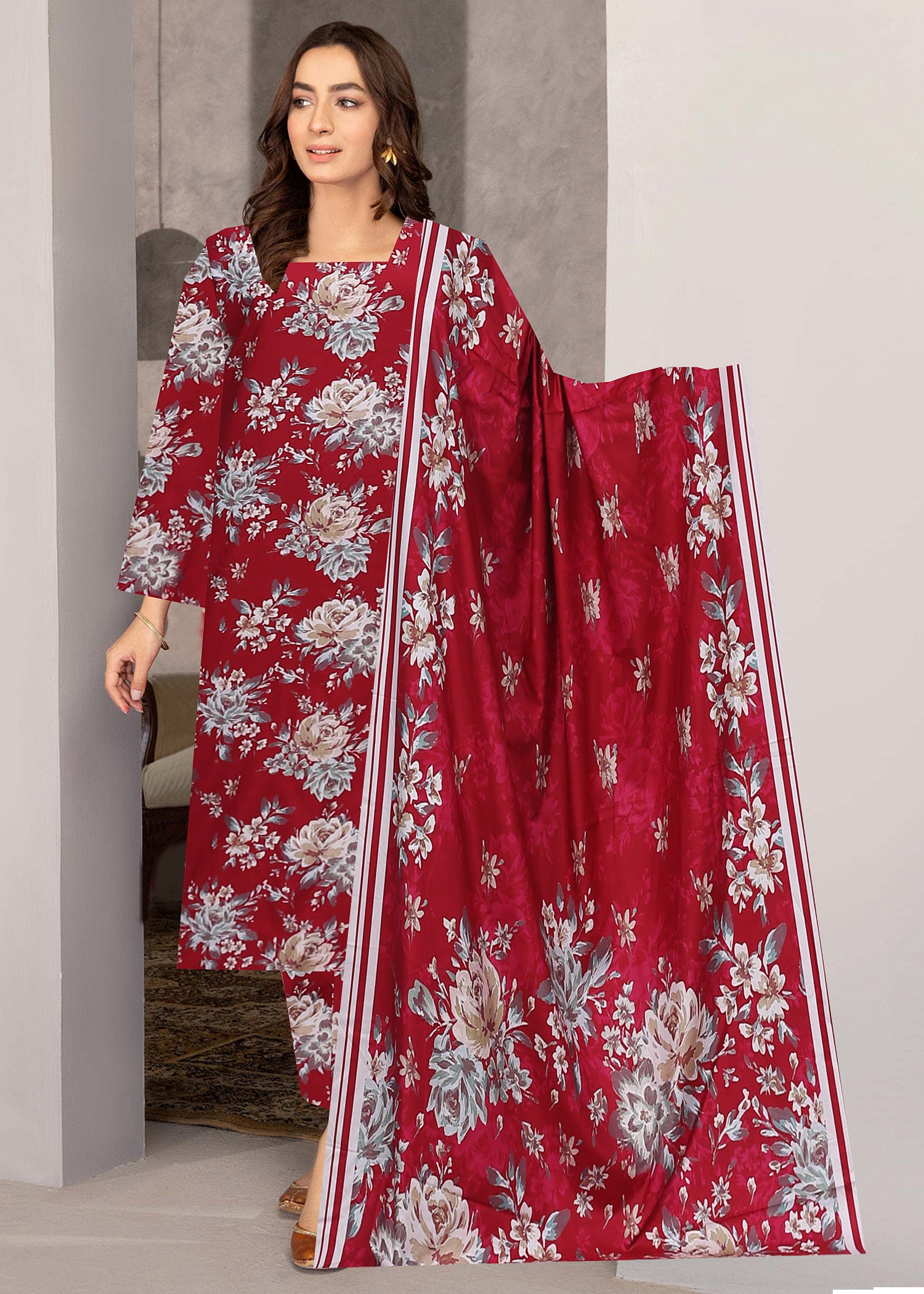 CHERRY RED 3pc Premium linen suit with linen dupatta (Unstitched)