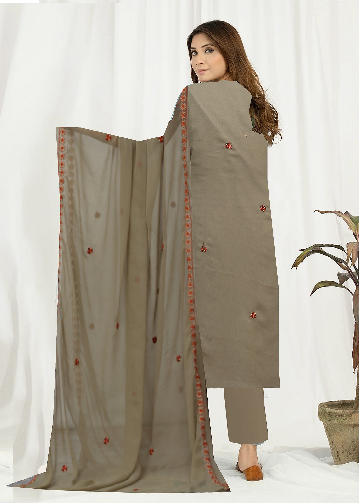 This Chiffon Embroidered Shirt and Dupatta with Grip trouser combines luxurious fabric with meticulous craftsmanship. The unstitched format features premium chiffon material adorned with intricate embroidery, creating a harmonious blend of traditional artistry and contemporary design. The dual-tone color palette offers sophisticated versatility, while the unstitched nature allows for precise tailoring to individual measurements and style preferences.