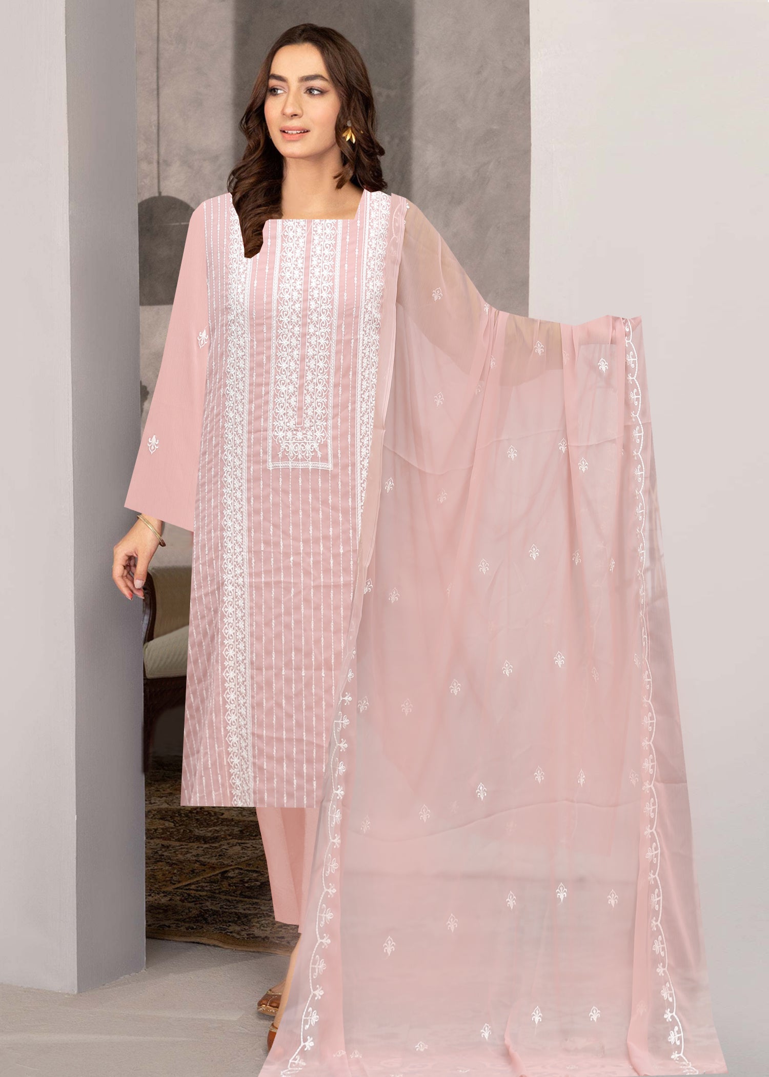 This Chiffon Embroidered Shirt and Dupatta with Grip trouser combines luxurious fabric with meticulous craftsmanship. The unstitched format features premium chiffon material adorned with intricate embroidery, creating a harmonious blend of traditional artistry and contemporary design. The dual-tone color palette offers sophisticated versatility, while the unstitched nature allows for precise tailoring to individual measurements and style preferences.