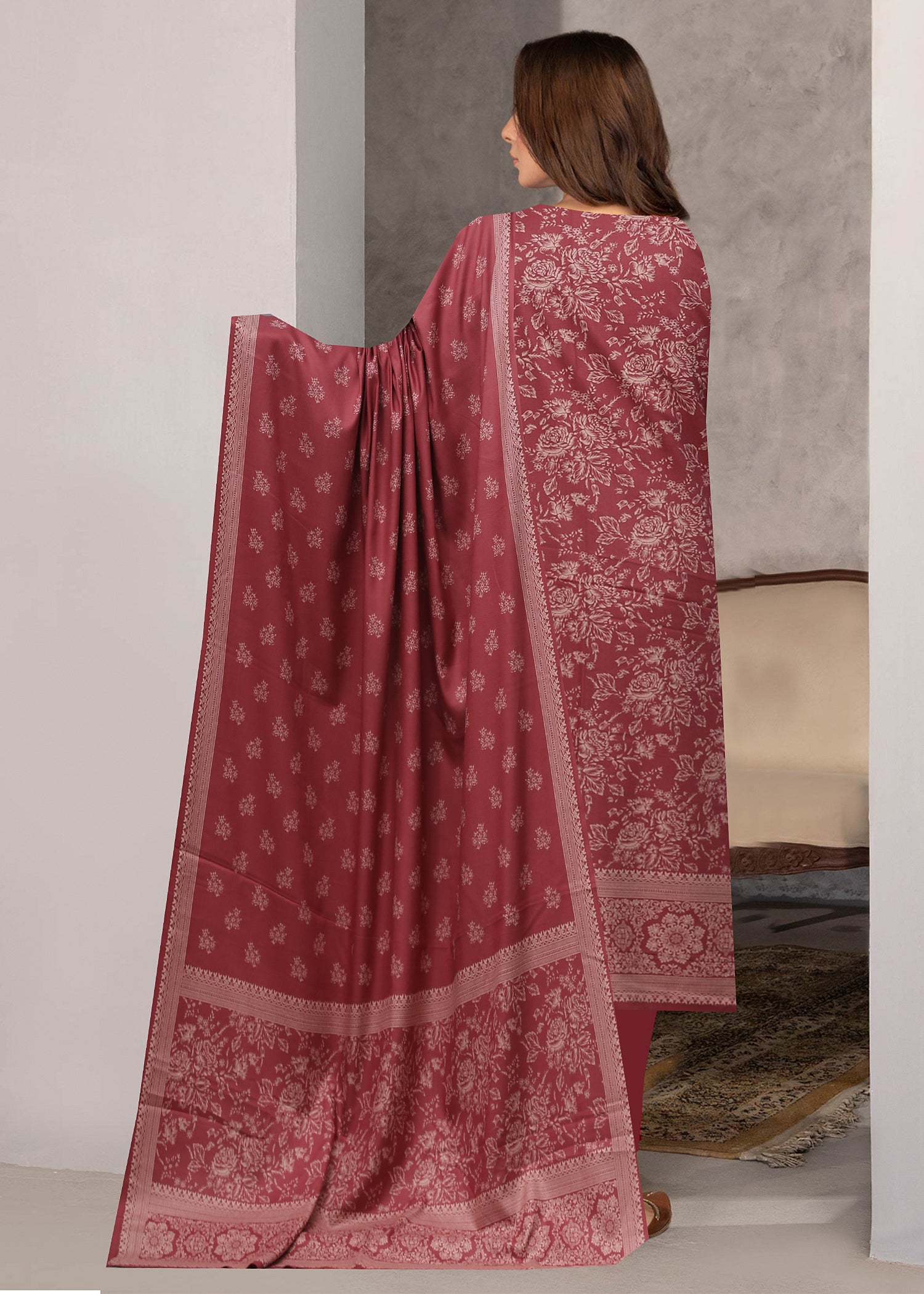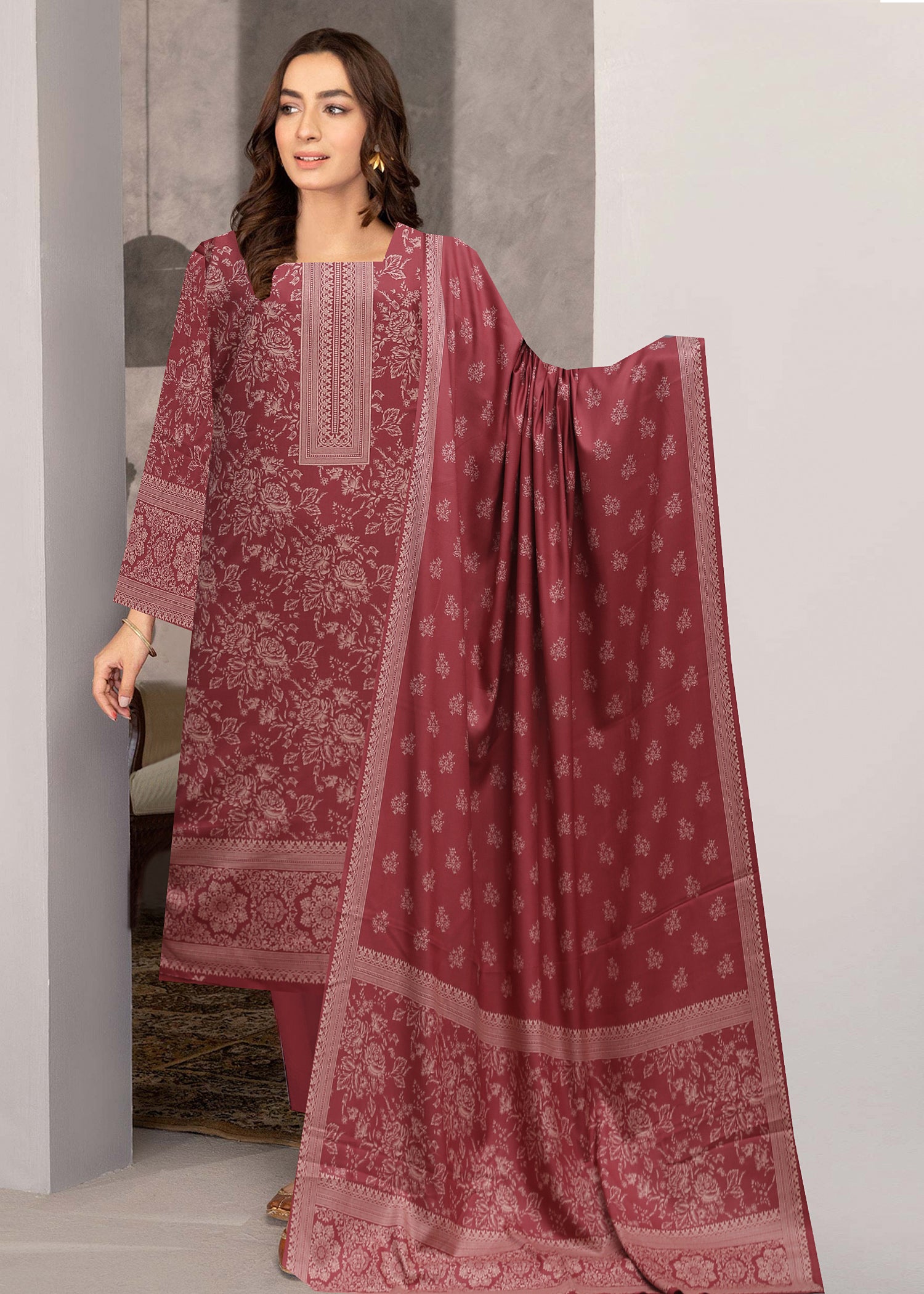 DEEP BLOSSOM PEACH 3Pc Premium Dhanak Printed Suits (Unstitched)