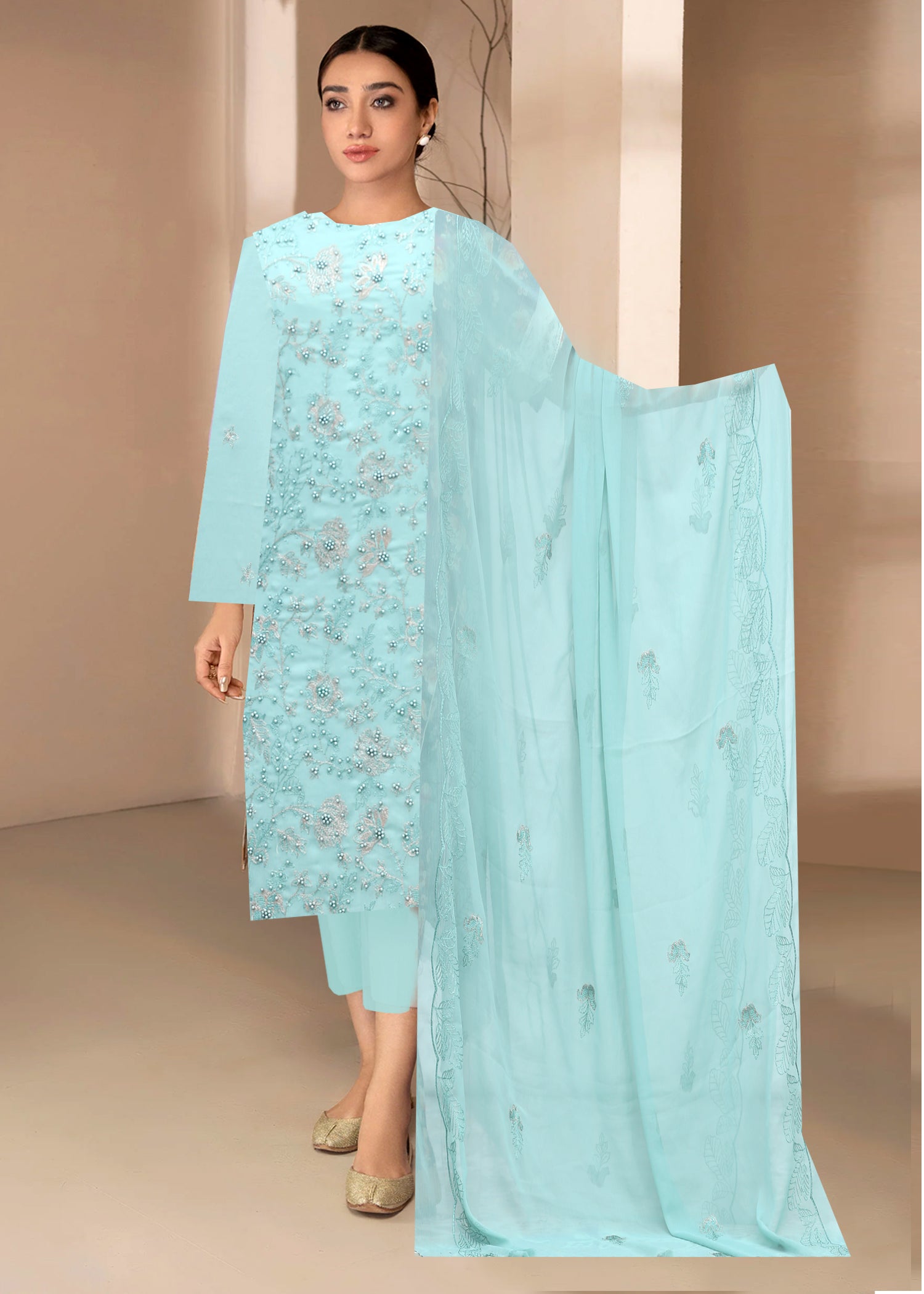 ICE BLUE Chiffon Embroidered with Beads 3Pc Suit (Unstitched)