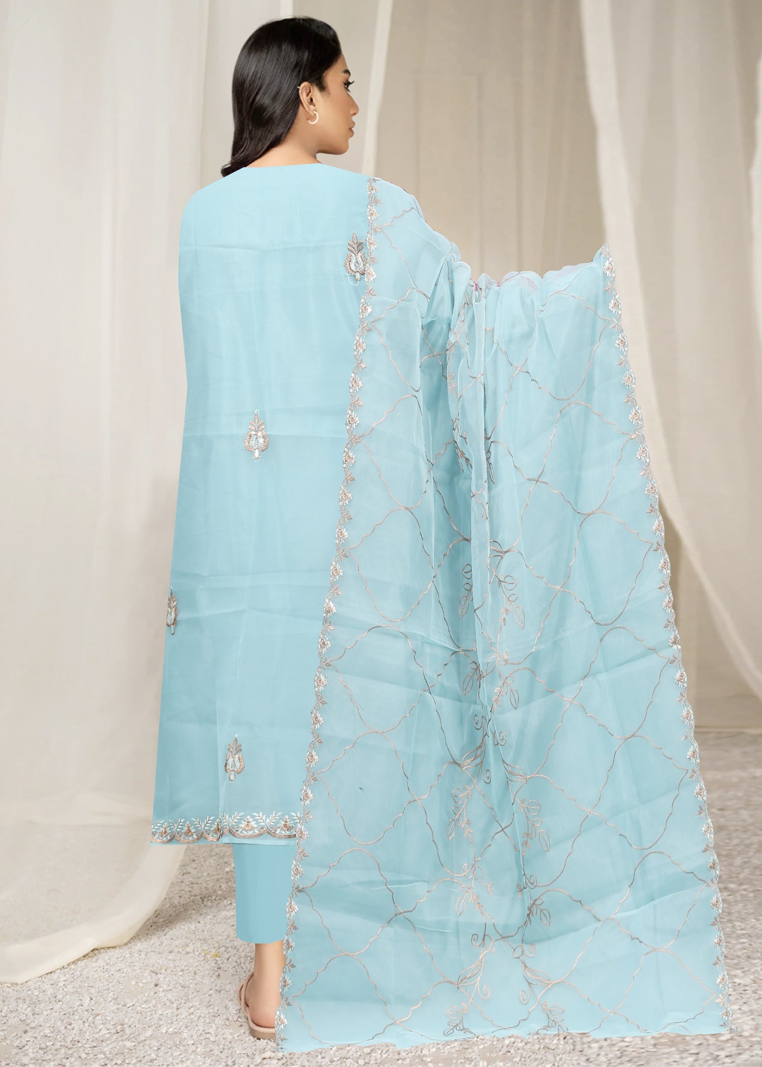 This Organza Embroidered Shirt and Dupatta with Grip trouser combines luxurious fabric with meticulous craftsmanship. The unstitched format features premium chiffon material adorned with intricate embroidery, creating a harmonious blend of traditional artistry and contemporary design. The dual-tone color palette offers sophisticated versatility, while the unstitched nature allows for precise tailoring to individual measurements and style preferences.