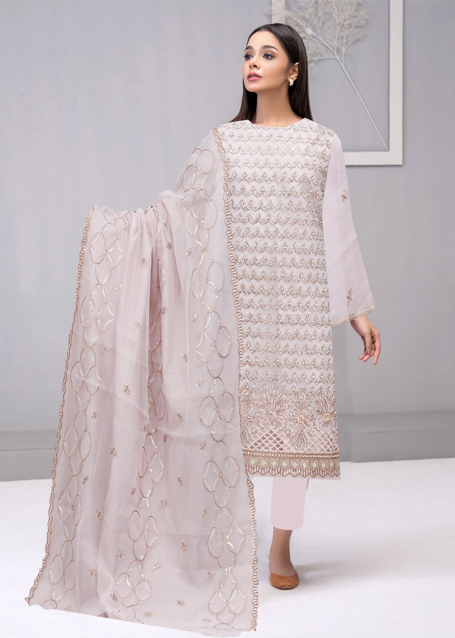 This Organza Embroidered Shirt and Dupatta with Grip trouser combines luxurious fabric with meticulous craftsmanship. The unstitched format features premium chiffon material adorned with intricate embroidery, creating a harmonious blend of traditional artistry and contemporary design. The dual-tone color palette offers sophisticated versatility, while the unstitched nature allows for precise tailoring to individual measurements and style preferences.
