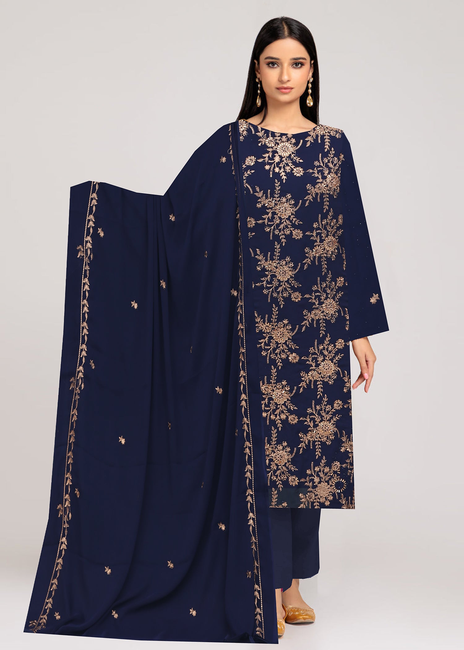 MIDNIGHT BLUE & BRONZE WITH STONEWORK Chiffon Embroidered 3Pc Suit (Unstitched)