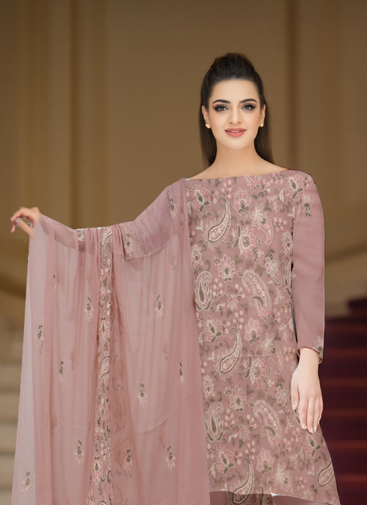 PEACHISH PINK & MEHNDI GREEN Chiffon Embroidered 3Pc Suit (Unstitched)